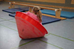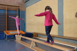 Spielerisch werden verschiedene Bewegungsmöglichkeiten ausprobiert und immer unterschiedlich aufgebaute Geräte „erobert“: Die Kinder können zum Beispiel gemeinsam mit elterlicher Begleitung über eine schräge Ebene balancieren oder vom Kasten auf eine Weichbodenmatte springen. Im gemeinsamen Spiel ergeben sich immer wieder neue Bewegungsanlässe zum Klettern, Hüpfen, Rollen, Werfen und Fangen, Schwingen oder Schaukeln…