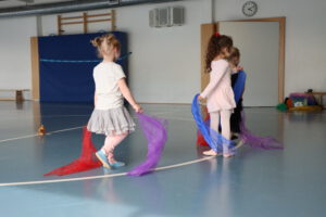 Spielerisch erobern die Kinder die Turnhalle mit kleinen und großen Geräten. Seilchen, Bälle, Pilonen, Rollbretter und ein großes Schwungtuch laden zum Experimentieren ein.