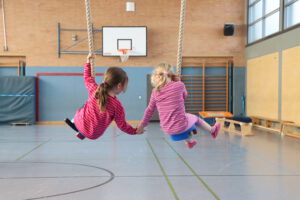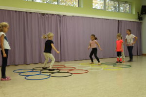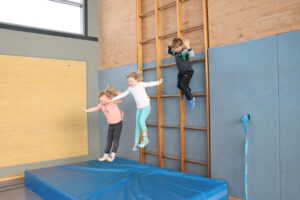 Spielerisch erobern die Kinder die Turnhalle mit kleinen und großen Geräten. Seilchen, Bälle, Pilonen, Rollbretter und ein großes Schwungtuch laden zum Experimentieren ein. Im gemeinsamen Spiel erfahren die Kinder beispielsweise, ihre Ideen zu äußern, auch mal abzuwarten und sich an Absprachen zu halten. Hier treffen sich Kinder mit ihren Freunden oder auch, um neue Spielkontakte zu knüpfen.